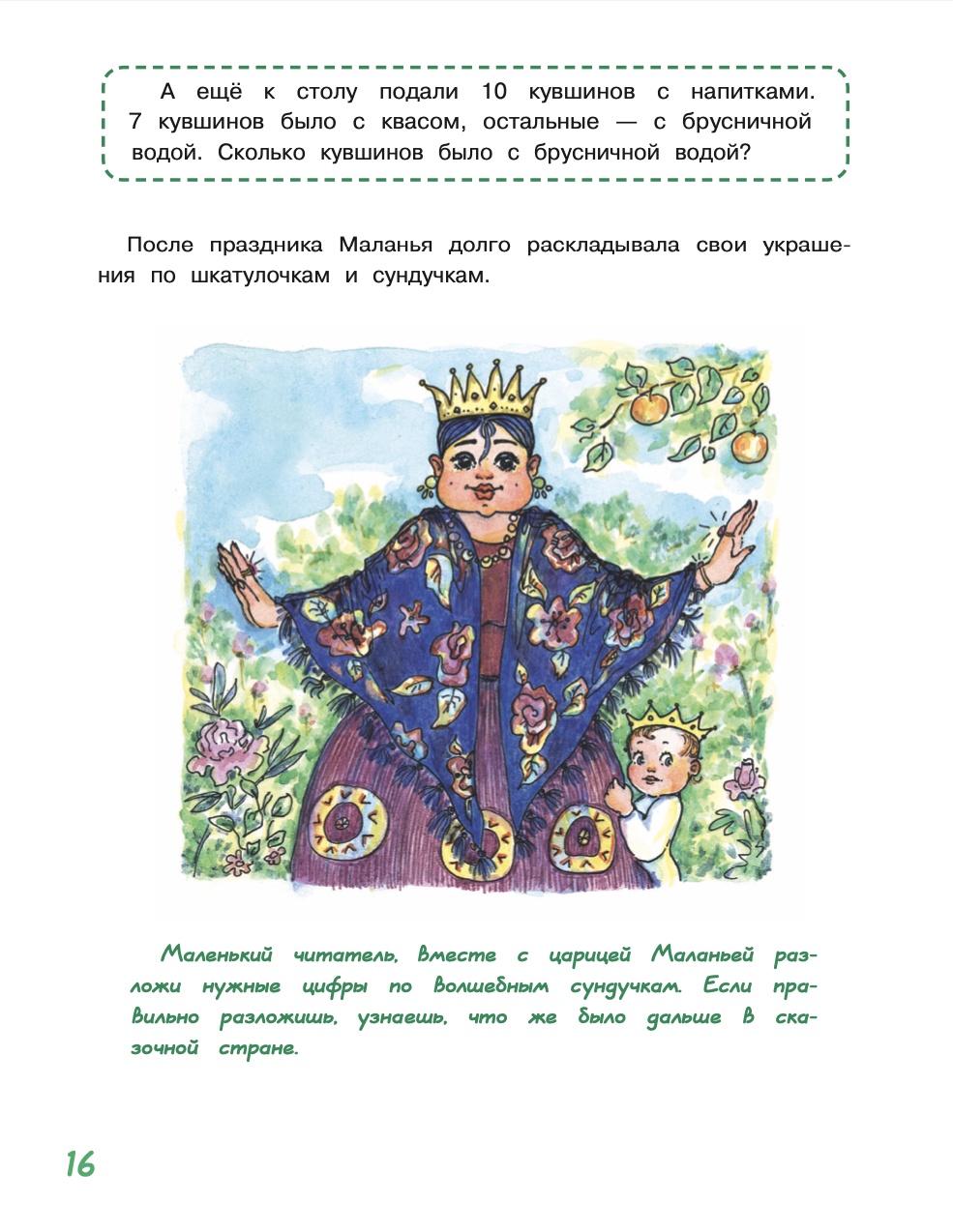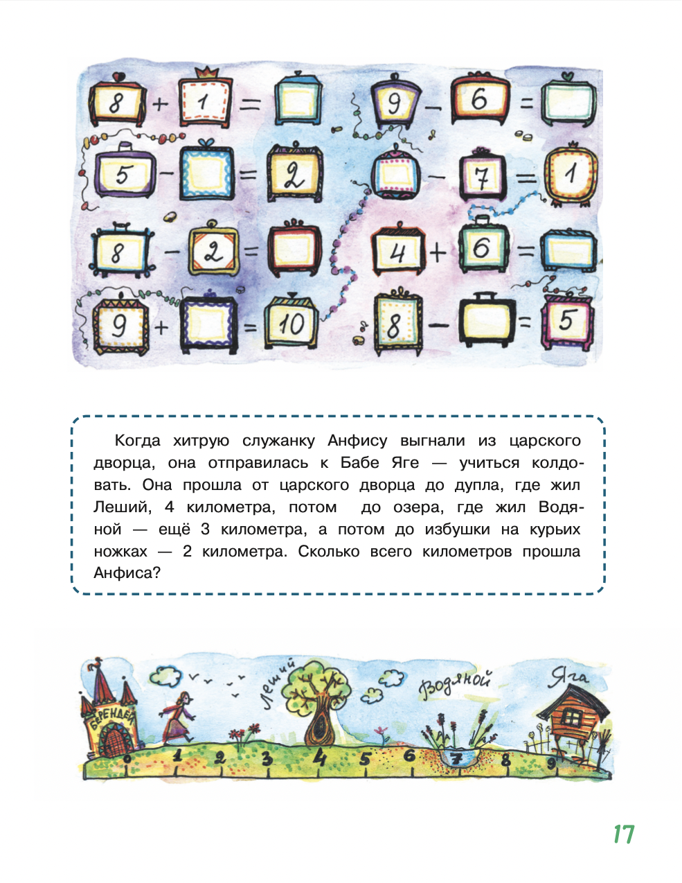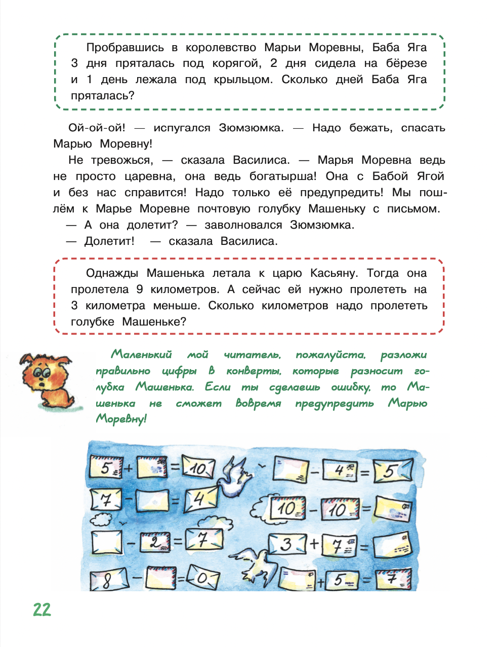 5+5). Увлекательный сюжет состоит из сказочных задачек. Василиса Прекрасная прислала девочке Асе понарошечного щенка, с ним они отправятся к царю Берендею, встретят Марью Моревну, Ягу, Джинна Балдахина, голубку Машеньку... Отличные результаты! Прекрасно — для подготовки к школе!
