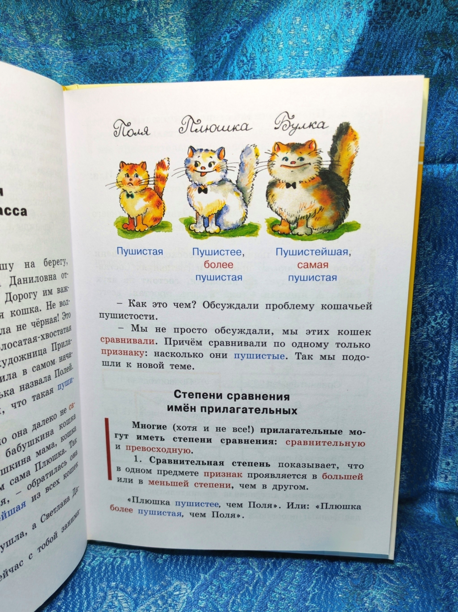 Тетенька Имя Прилагательное — художница. Раскрашивает существительные, и у них появляются признаки. Кошка становится КАКОЙ? пушистой, усатой, полосатой. Дерево становится КАКИМ? высоким, зеленым, ветвистым. При помощи дидактических сказок, стихов и картинок объясняются сложные темы: степени сравнения; краткие прилагательные; качественные, относительные, притяжательные; переход прилагательного в существительное...